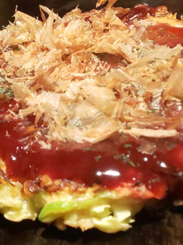 おいしそうなお好み焼きです。躍動する鰹節とシズル感あふれるソースの照り。